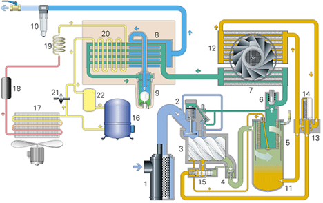 空氣從空氣過濾器(1)吸入,經(jīng)卸荷閥(2)進(jìn)入壓縮機(jī)主機(jī)(3)后被壓縮,壓縮后的油氣混合物通過單向閥(4)進(jìn)入儲(chǔ)氣罐/油氣分離器(5),分離后的壓縮空氣經(jīng)最小壓